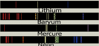 Quand un composé est vaporisé et que sa vapeur est chauffée jusqu'à émission de lumière, une couleur unique prédomine, comme le jaune des lampes à vapeur de sodium, le rouge des lampes au néon et le bleu-vert des lampes à vapeur de mercure. Le spectre du composé vaporisé est alors formé de plusieurs raies séparées par des zones de noir absolu.
